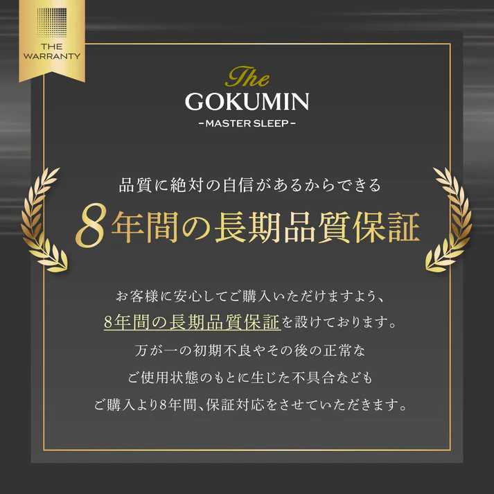 GOKUMINのマットレスは低価格でありながら保証制度が充実しています。未開封であれば30日間返品保証に対応していますし、全マットレスに1年もしくは8年保証がついているため、ネット販売でも安心して購入することができます。